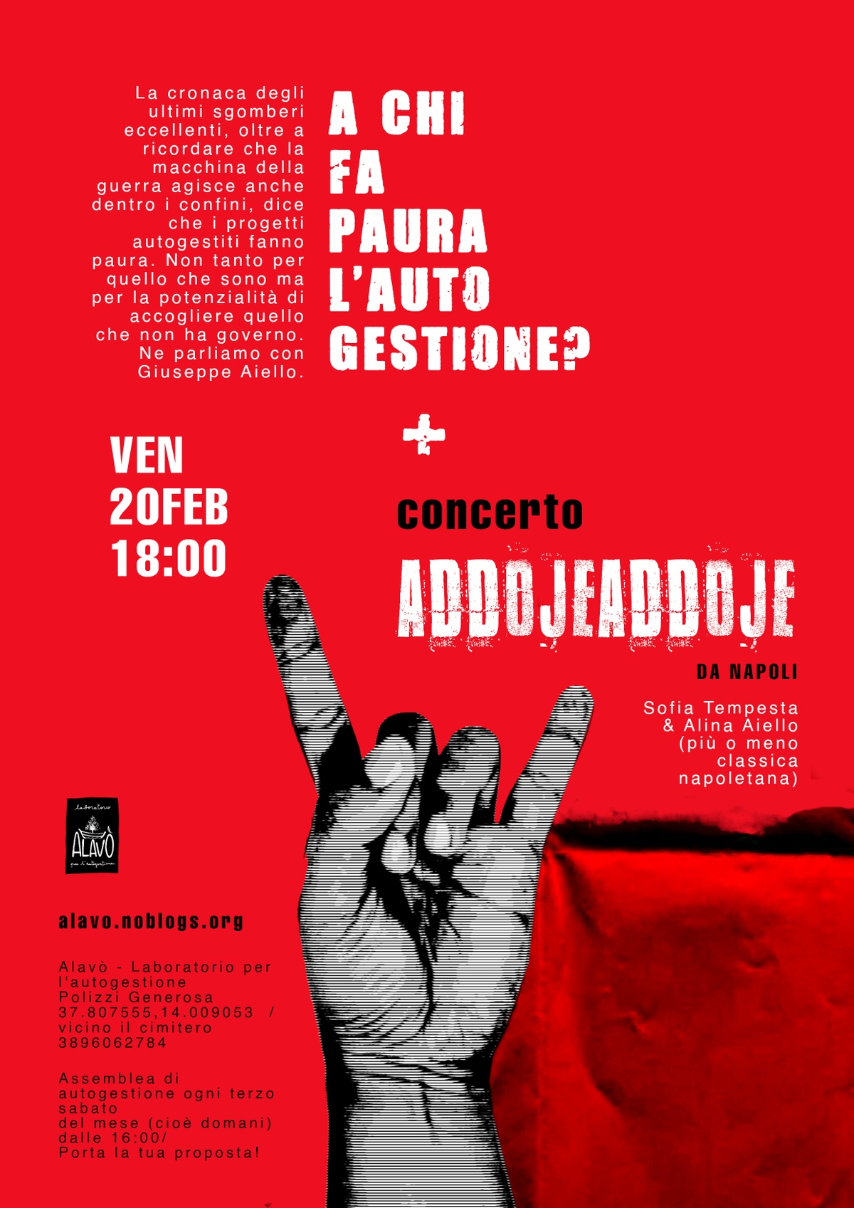 Venerdì 20 febbraio, dalle 18. Poi cena e concerto con le ADDOJEADDOJE. La cronaca degli ultimi sgomberi eccellenti, oltre a ricordare che la macchina della guerra agisce anche dentro i confini, dice che i progetti autogestiti fanno paura. Non tanto per quello che sono ma per la potenzialità di accogliere quello che non ha governo. Ne parliamo con Giuseppe Aiello