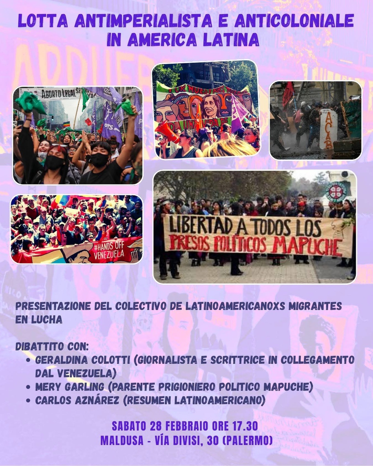 Presentazione del Colectivo de latinoamericanxs migrantes en lucha e dibattito per condividere aggiornamenti sulle forme di lotta e resistenza antimperialiste e anticoloniali dei popoli del Venezuela, Cuba, Argentina e del popolo Mapuche.