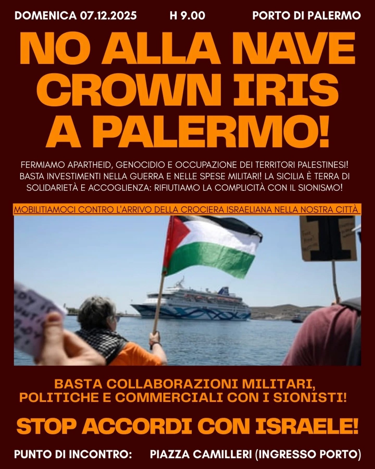Mobilitiamoci contro l’arrivo della nave di lusso da crociera israeliana nella nostra città , a bordo turisti “stressatx dal conflitto” ; contro ogni accordo militare e commerciale con lo Stato genocida di Israele. Sempre solidali con la Palestina che resiste e con tutte le popolazioni oppresse.