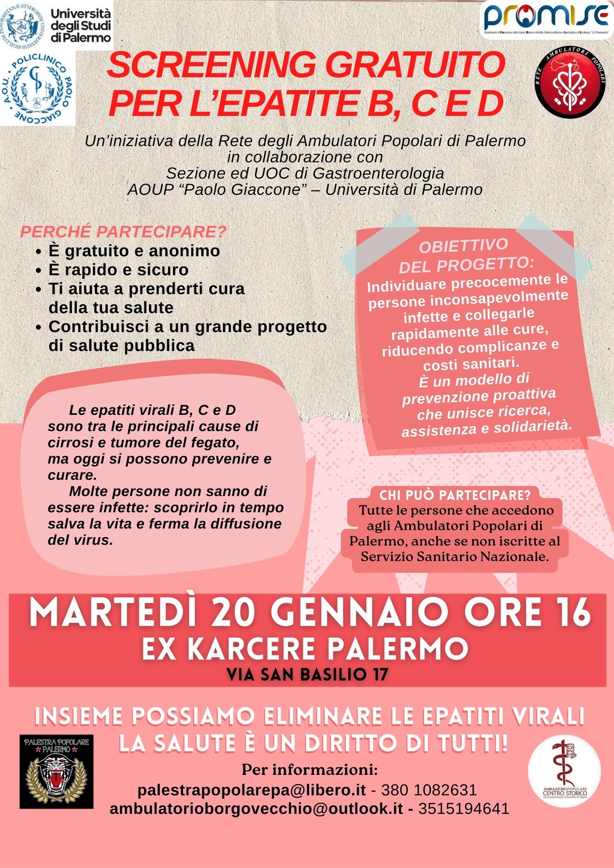 Insieme alla Palestra popolare, alla Rete degli Ambulatori Popolari e grazie al supporto del team medico del reparto di gastroenterologia del Policlinico di Palermo, trascorreremo un pomeriggio all'ExKarcere interamente dedicato alla cura, alla prevenzione e alla solidarietà.